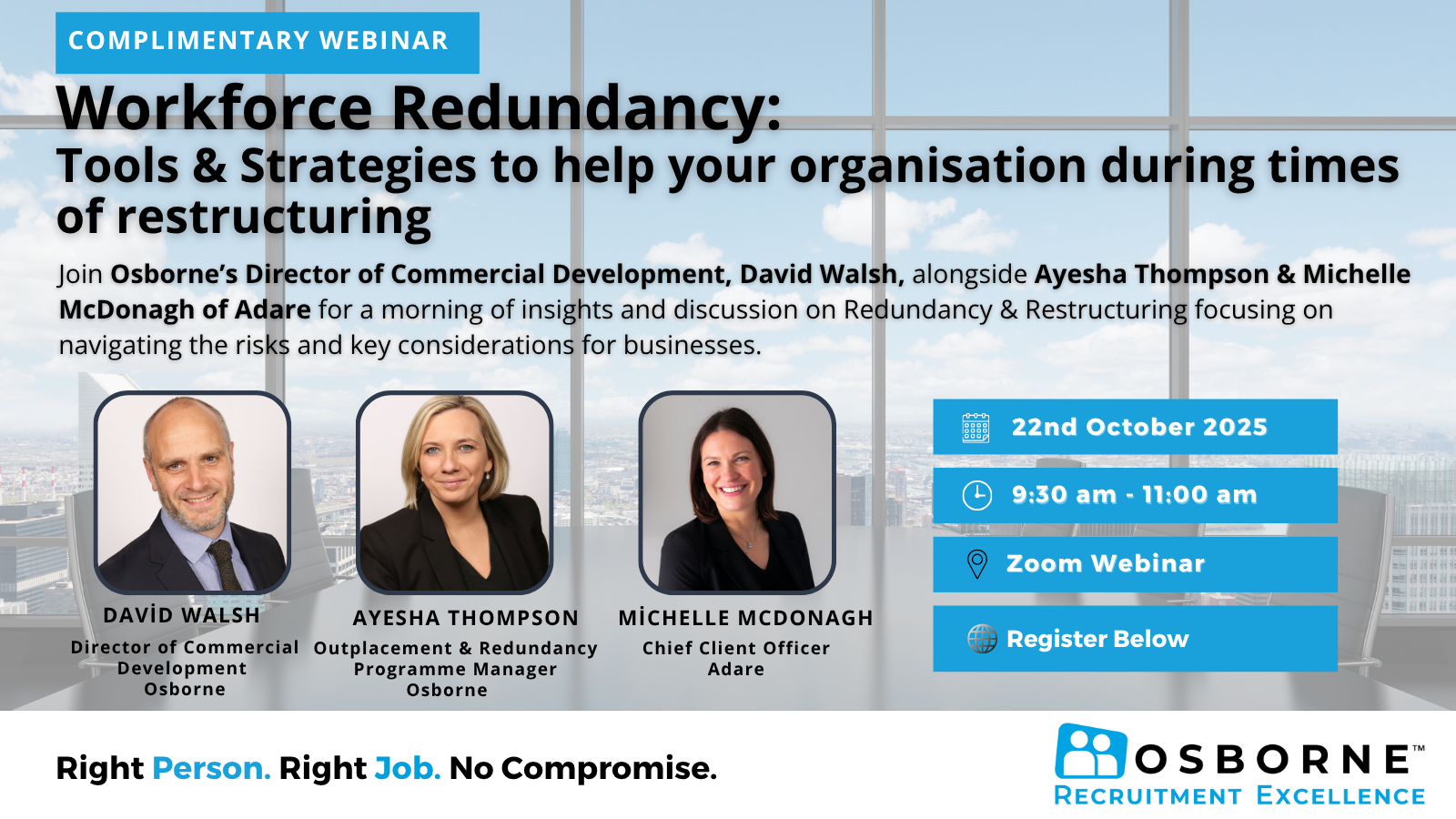 Osborne Talent Series Webinar: Workforce Redundancy - Tools & Strategies to help your Organisation during times of restructuring Complimentary Webinar Date:                    Wednesday 22nd October 2025 Time:                    09:30am –...